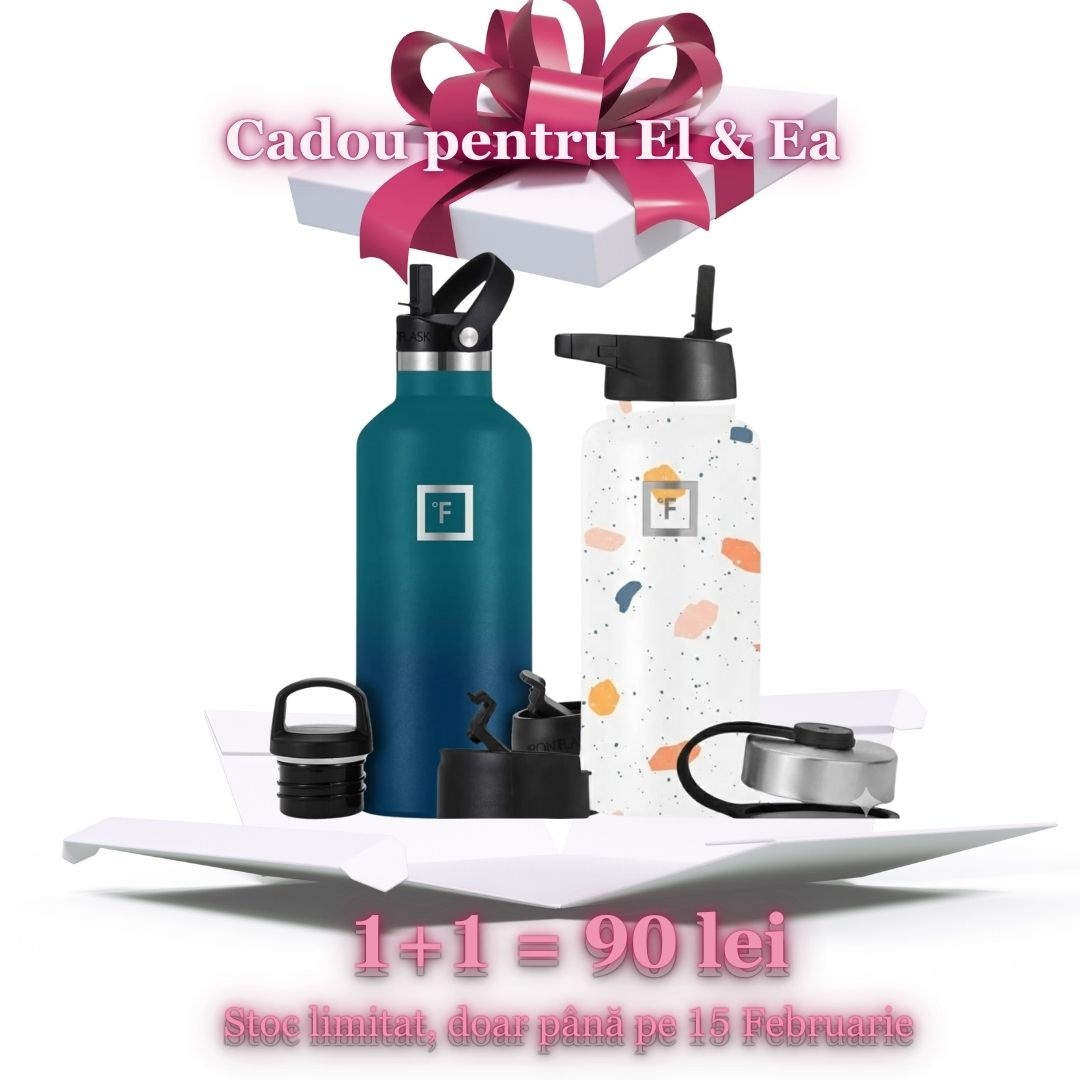 Set sticlă Iron °Flask, rece 24h / cald 12h – ideal pentru drumeții, sport sau picnic în doi. Bonus: vine cu o sticlă cadou, perfectă pentru partajarea aventurilor. 🥂