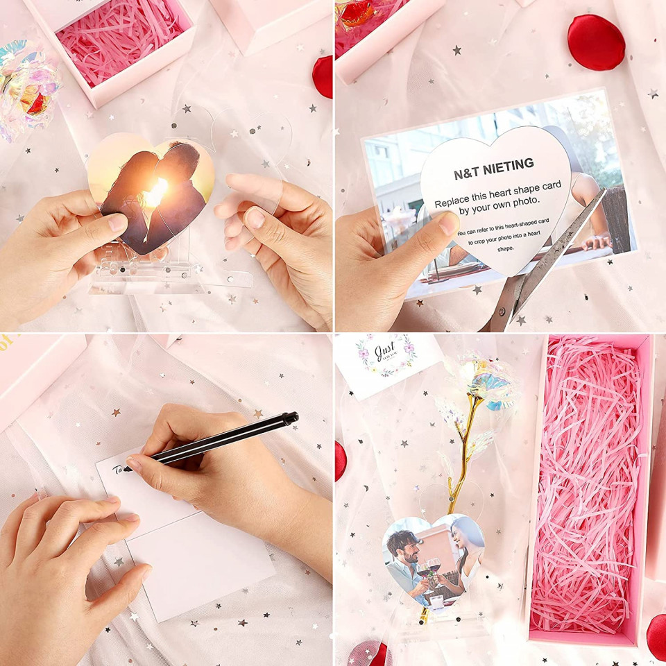 Transformă un gest romantic într-un suvenir de neuitat cu acest trandafir fermecat NT NIETING. Petalele aurii și roz translucide captează lumina în moduri surprinzătoare, schimbându-și subtil culorile și adăugând un efect magic fiecărei încăperi. Suportul acrilic în formă de inimă permite să inserezi o fotografie sau să scrii câteva cuvinte speciale pe spate, făcând trandafirul nu doar un cadou, ci și o mică capsulă a amintirilor voastre. Durabil, elegant și plin de farmec, acest trandafir va rămâne o amintire dulce de Dragobete sau Valentine’s Day. 🌹✨