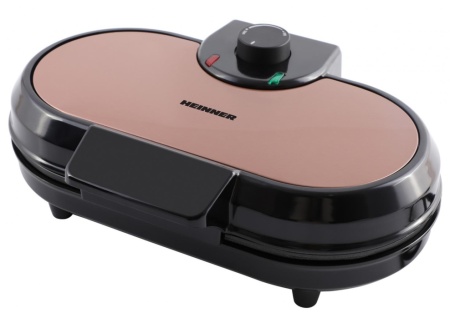 Aparat de facut gofre Heiiner HWF-1000CR, putere: 1000 W, buton pentru reglarea temperaturii, placi cu invelis antiaderent, indicator luminos “ON”, indicator luminos “gata de folosire”, maner rece, placi gofre 13,97 cm, culoare negru/aramiu, garantie: 36 luni