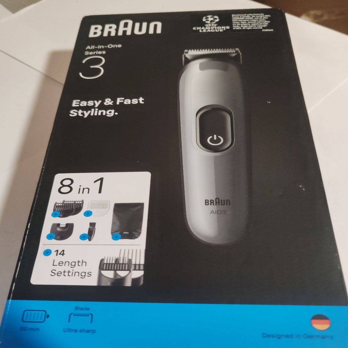 Aparat de tuns multifunctional Braun All-in-One Seria 3 AIO3540, 8-in-1, Lama ultra ascutita, 6 Piepteni, 1 Perie de curatare, 1 Saculet, 14 Setari de lungime , Autonomie 50 minute, Gri argintiu lucios, Resigilat, Grad A