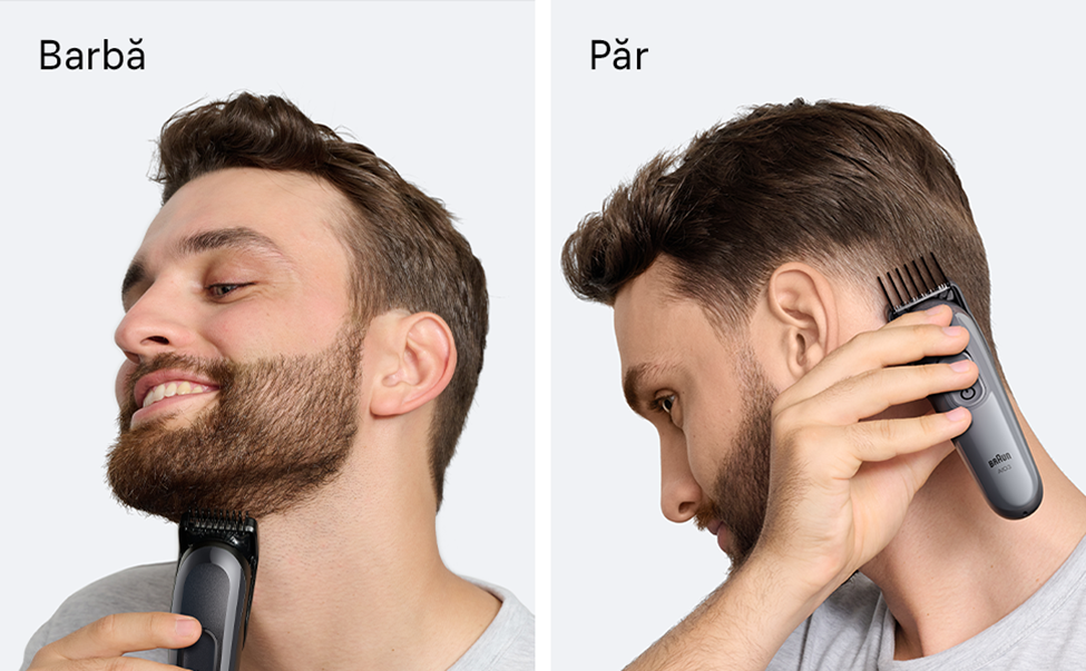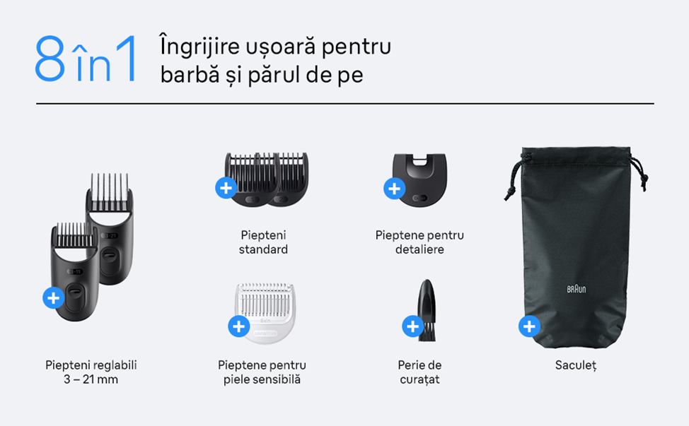 Ingrijire usoara si rapida a barbii: setul de ingrijire multifunctional 8-in-1 de la Braun include accesorii selectate pentru tunsul barbii si al parului. |