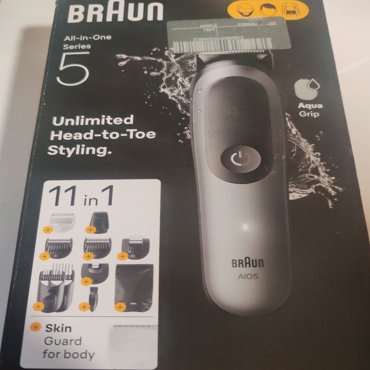 • Aparat de tuns multifunctional Braun All-in-One Seria 5 AIO5560, 11-in-1, Lama ultra ascutita, 7 Piepteni, 1 Mini Cap de ras, 1 Cap tuns SkinGuard, 1 Perie de curatare, 1 Saculet, AquaGrip pentru control sub dus, Autonomie 120 minute, Resigilat, Grad A - Img 1