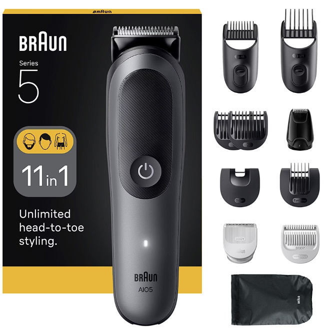 Ingrijire completa, din cap pana in picioare: aparatul multifunctional Braun 11-in1 include accesorii selectate pentru ingrijirea barbii, tunderea parului si indepartarea parului de pe intregul corp.