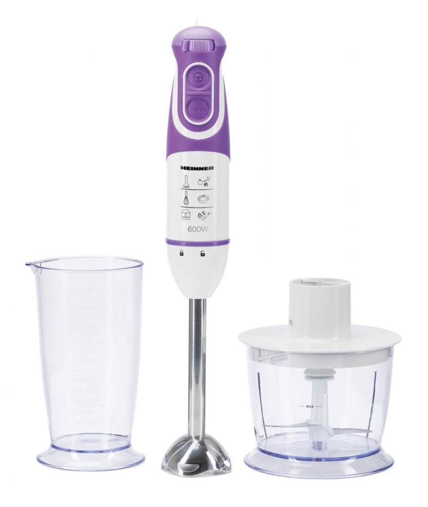 Blender de mana Heinner HB-600UV, multifunctional: tocator, tel si cana de mixat, putere: 600W, 5 viteze + turbo, capacitate cana: 700 ml, capacitate tocator: 500 ml, picior blender metalic detasabil, cutit de inox, culoare: ultraviolet, garantie: 36 luni