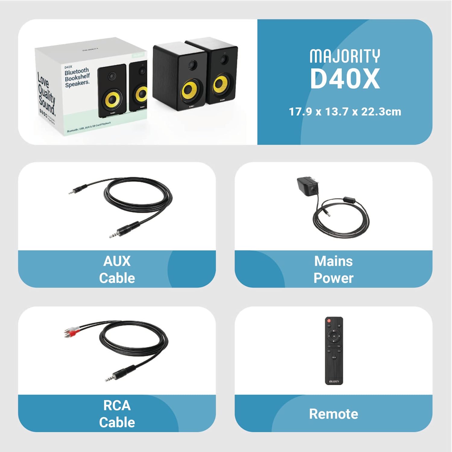 - WHAT'S IN THE BOX : Acest pachet include 2x difuzoare D40X, telecomanda, cabluri si manual. Dimensiuni: 17,9 x 13,7 x 22,3 cm. Greutate: 3,8 kg.