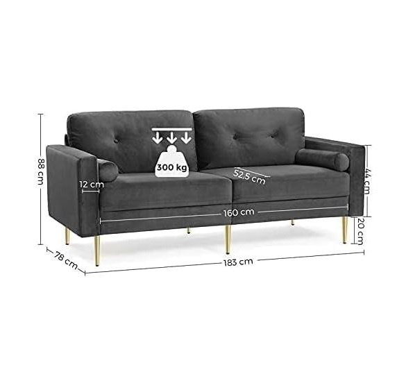 Canapea Vasagle, 3 locuri, catifea/lemn/metal, gri/auriu, 78 x 88 x 183 cm – Rafinament, confort și durabilitate pentru casa ta