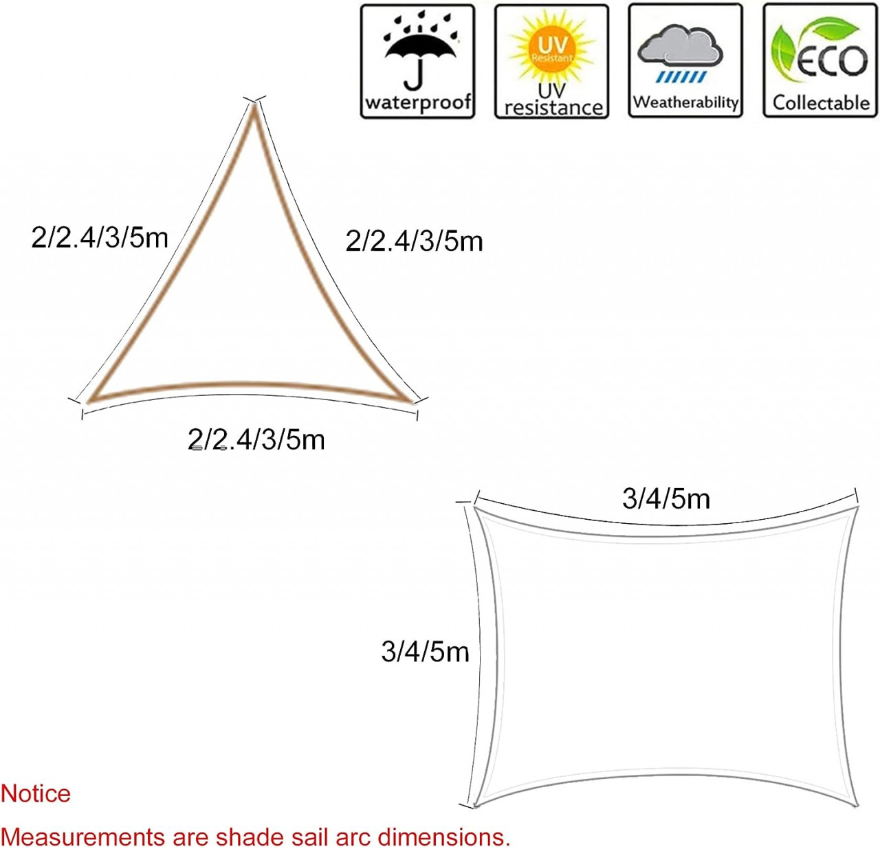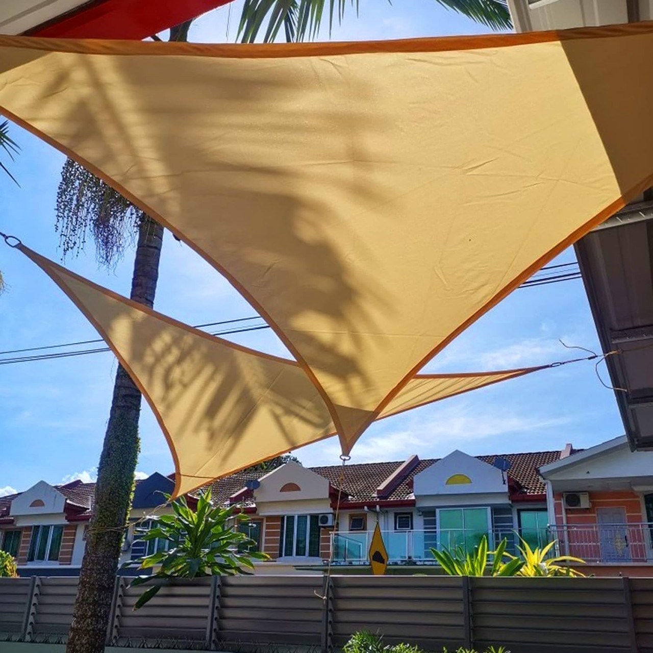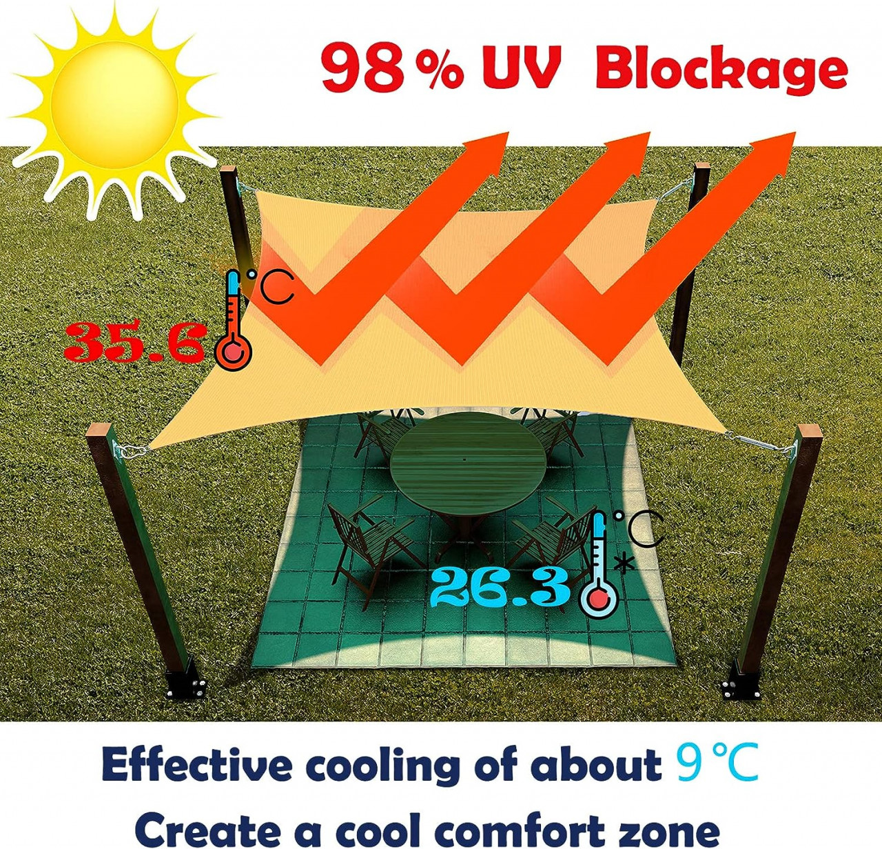 BLOC UV 98%: pânza de umbră este fabricată din țesătură de poliester de înaltă densitate și respirabilă, blochează până la 98% din razele UV dăunătoare ale soarelui și este respirabilă pentru a permite aerului cald să scape, reducând substanțial temperaturile sub velă.REZISTENT LA APĂ: Cu această velă impermeabilă, vă puteți adăposti și vă puteți bucura de protecție UV maximă la umbra velei, fără să vă faceți griji cu privire la ploaia neașteptată. Notă: Trebuie să fie atârnat în tensiune completă, cu o pantă de cel puțin 20 de grade pentru scurgerea apei, mai degrabă decât să se grupeze în mijloc.