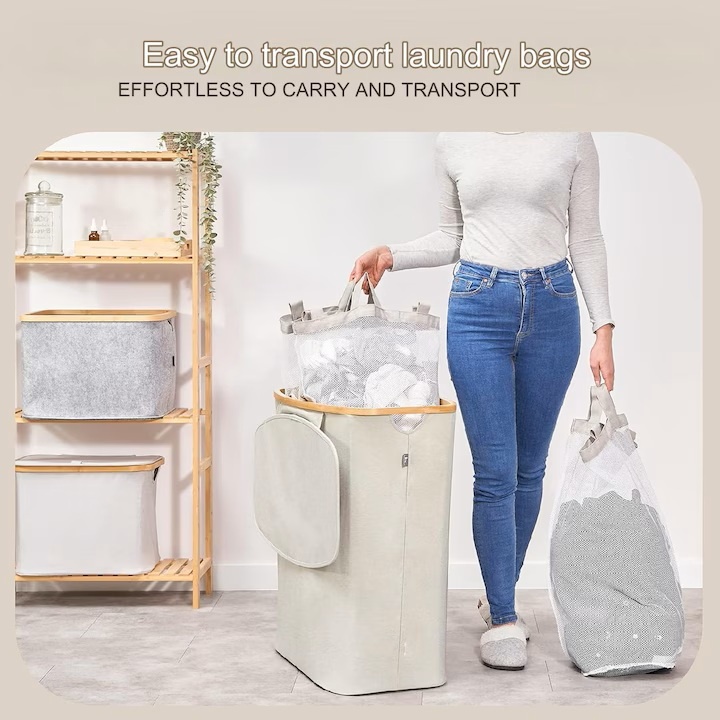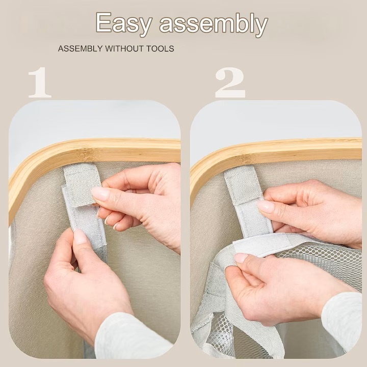 - Usor de utilizat: utilizati imediat dupa sosire. Organizatorul de rufe este asamblat cu patru tije care trebuie pur si simplu introduse sub marginea de bambus. Sacii de rufe sunt tinute la locul lor folosind velcro.