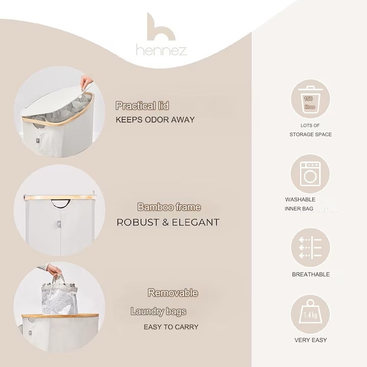 - Usor de utilizat: Cu cosul de rufe Hennez primesti cele trei saci de rufe detasabile incluse. Datorita capacului care se inchide, mirosurile neplacute sunt tinute departe. Capacitatea de 150L creeaza spatiu pentru cantitati de rufe murdare.