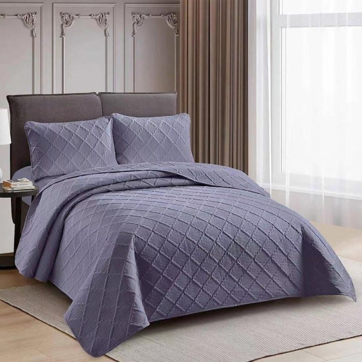 Cuvertura matlasata dimensiunea 230x250 cm si 2 fete de perna 50x70 cm, pat matrimonial, colectia Pucioasa, uni, model romburi, culoare antracit