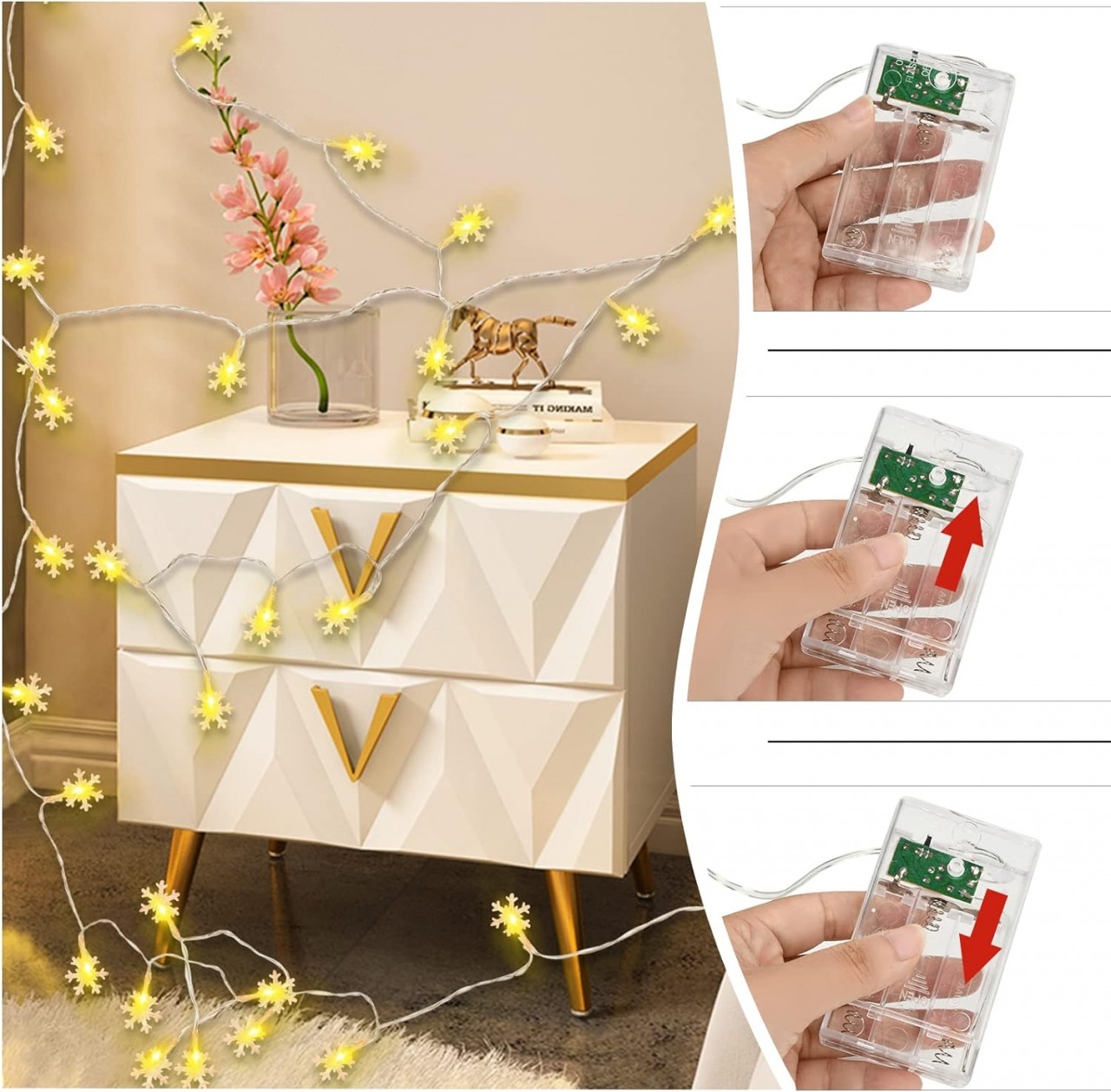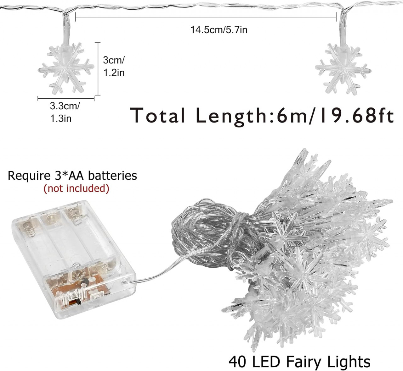 Luminile noastre de Crăciun au o lungime totală de 6 m, cu 40 de lumini LED cu fulgi de zăpadă, unghi de vizualizare de 360 de grade lasă luminile să strălucească în toate direcțiile, culoarea albă caldă poate crea o atmosferă vibrantă și confortabilă, ideală pentru orice festival, decor interior, exterior.