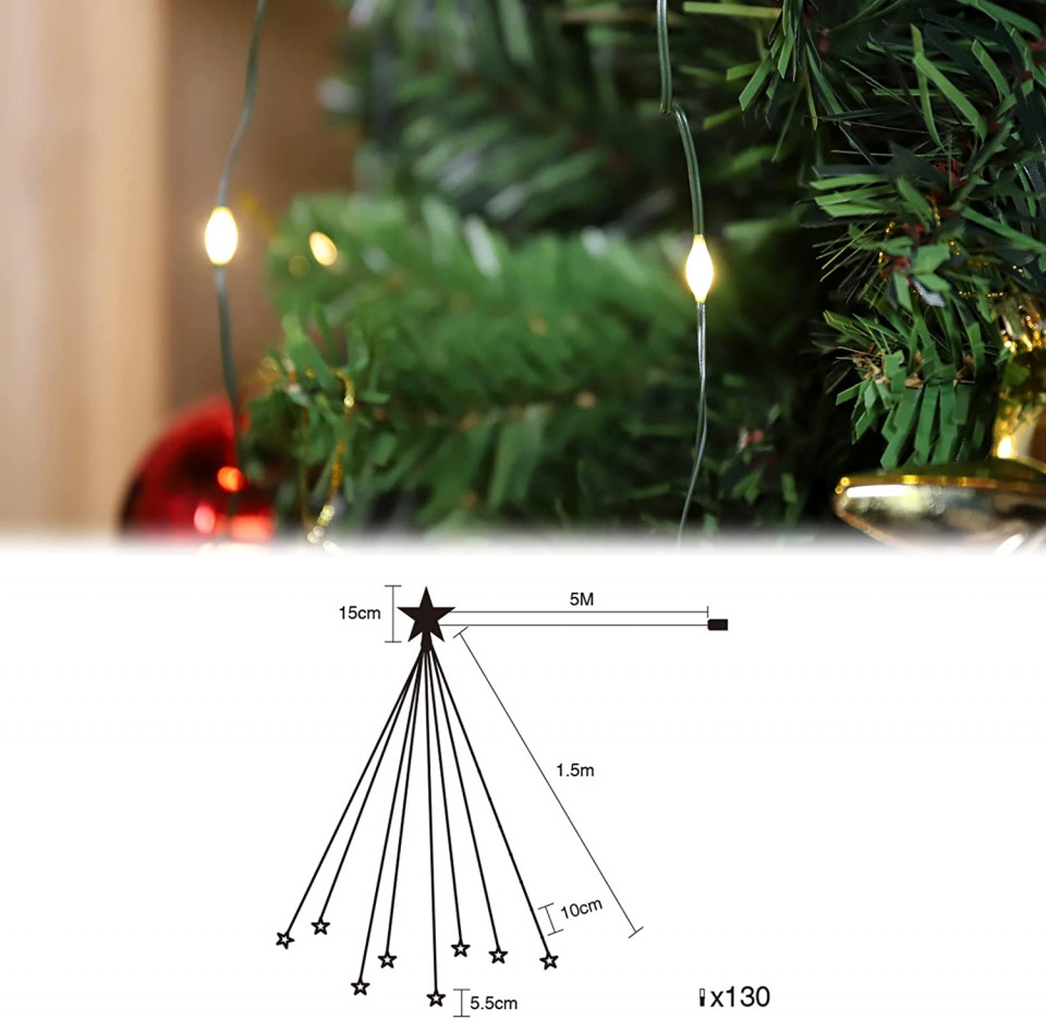 - Lungime variabilă: Disponibilă în două opțiuni de lungime (2 m x 8 inele și 1,5 m x 8 inele), instalația se potrivește perfect pe orice brad de Crăciun sau decor festiv.
