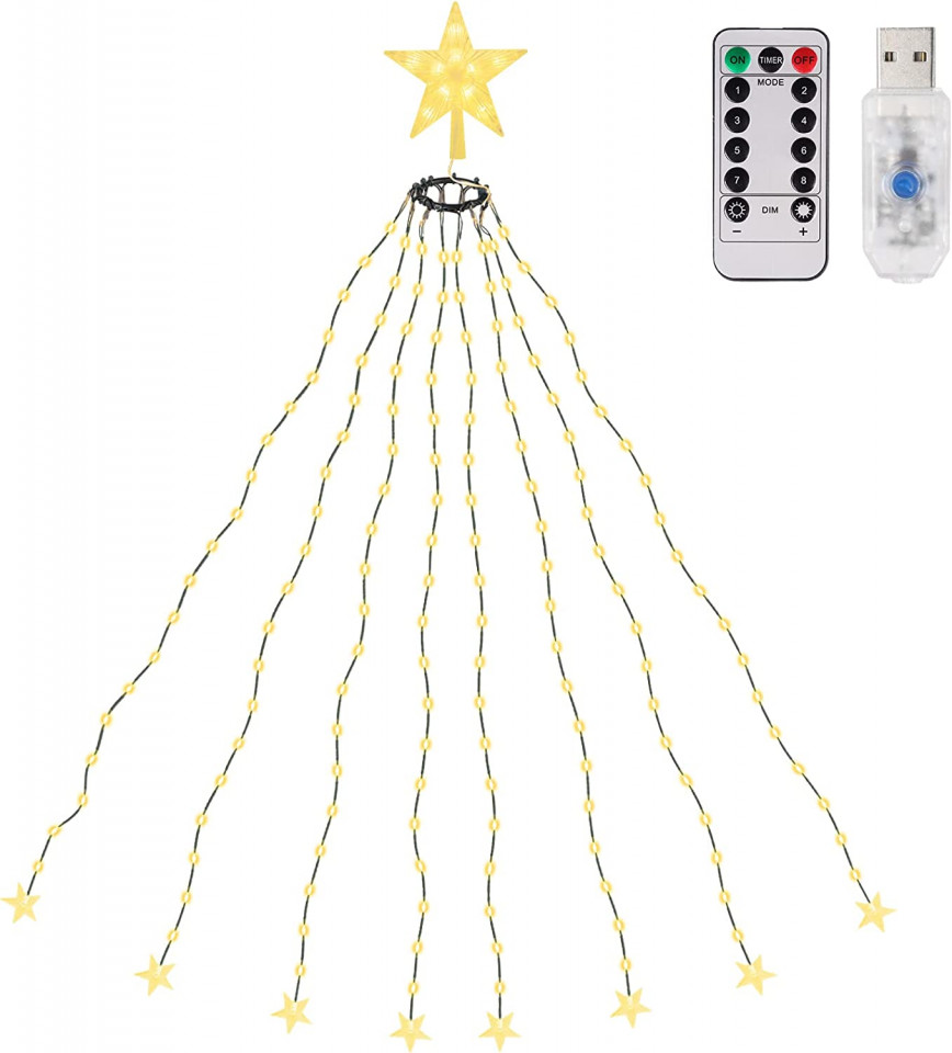 Instalatie si stea pentru bradul de Craciun Salcar, LED, alb cald, 150 cm