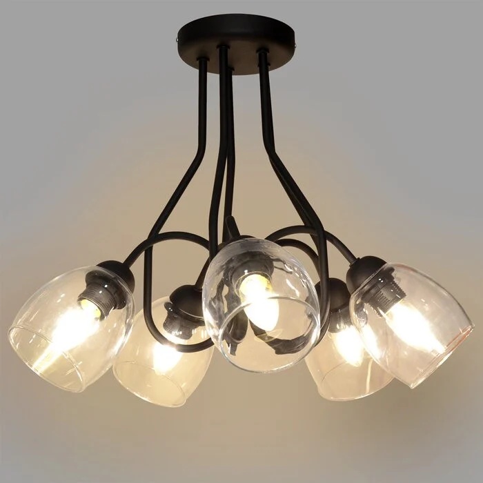 Lustra Ahlanni aduce un accent industrial-chic în orice spațiu, combinând eleganța finisajului negru mat cu frumusețea sticlei transparente lucrate manual. Cele 5 abajururi creează un joc spectaculos de lumini și umbre, transformând orice cameră într-un spațiu sofisticat și modern.