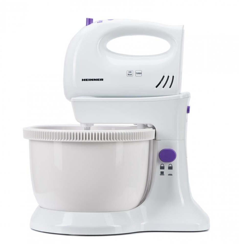 Mixer cu bol Heinner HMB-350UV, putere: 300W, 5 viteze+turbo, bol rotativ: 2.5 litri, accesorii din inox: 2 teluri + 2 carlige pentru framantare, buton ejector cu dispozitiv de siguranta, buton eliberare mixer de mana, culoare: ultraviolet