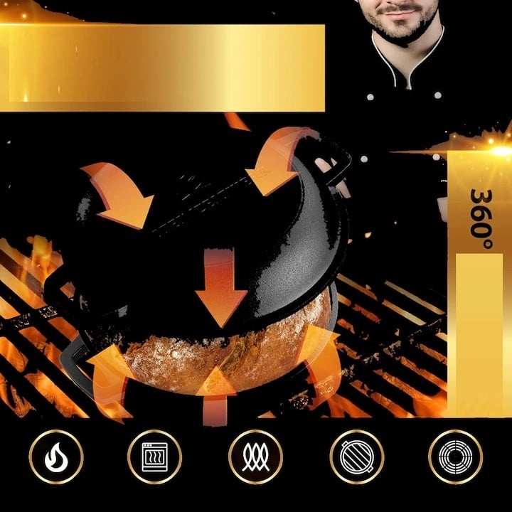 Oala cu capac Steinzeitwerk din fonta, 4.6 l, pentru cuptor, plita, gaz, electric, cu inductie, cu cos pentru aluat si racleta, 26 cm