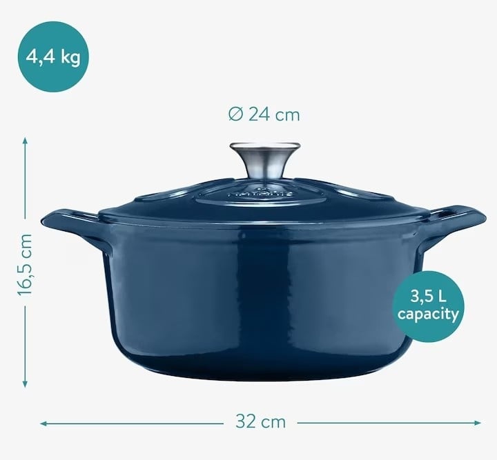 Oala fonta emailata Navaris, albastru, cu capac, pentru cuptor, plita, gaz, electric, cu inductie, cu infrarosu, 24 cm, 3.5 l, Resigilat, Grad B