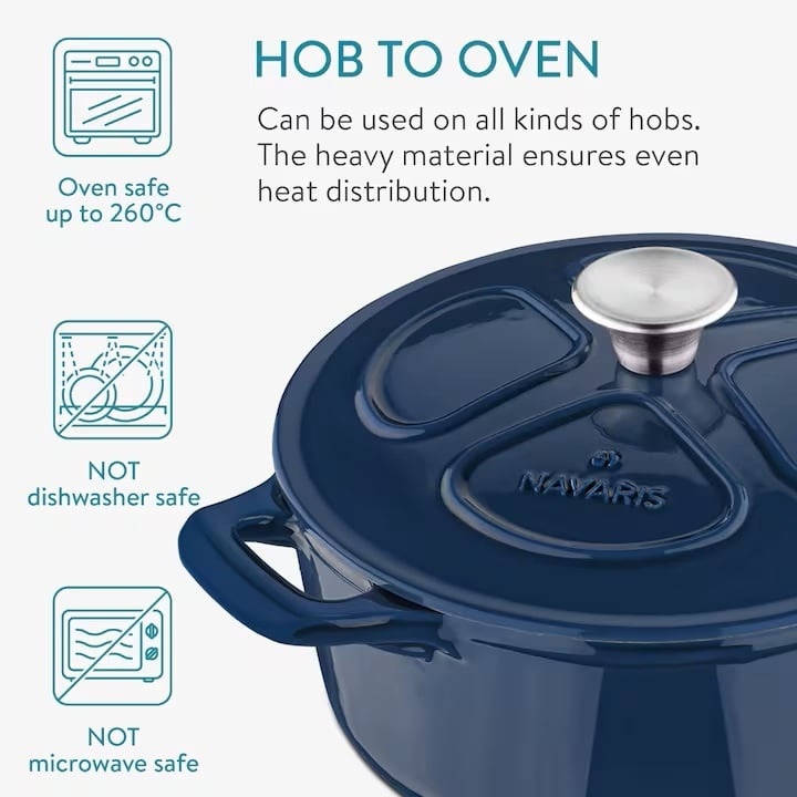 PLATA SI IN CUPTORCuptorul olandez Navaris poate fi folosit pe toate tipurile de plite, inclusiv pe inductie. Atat oala cat si capacul sunt potrivite pentru cuptorul pana la 260 de grade Celsius. |