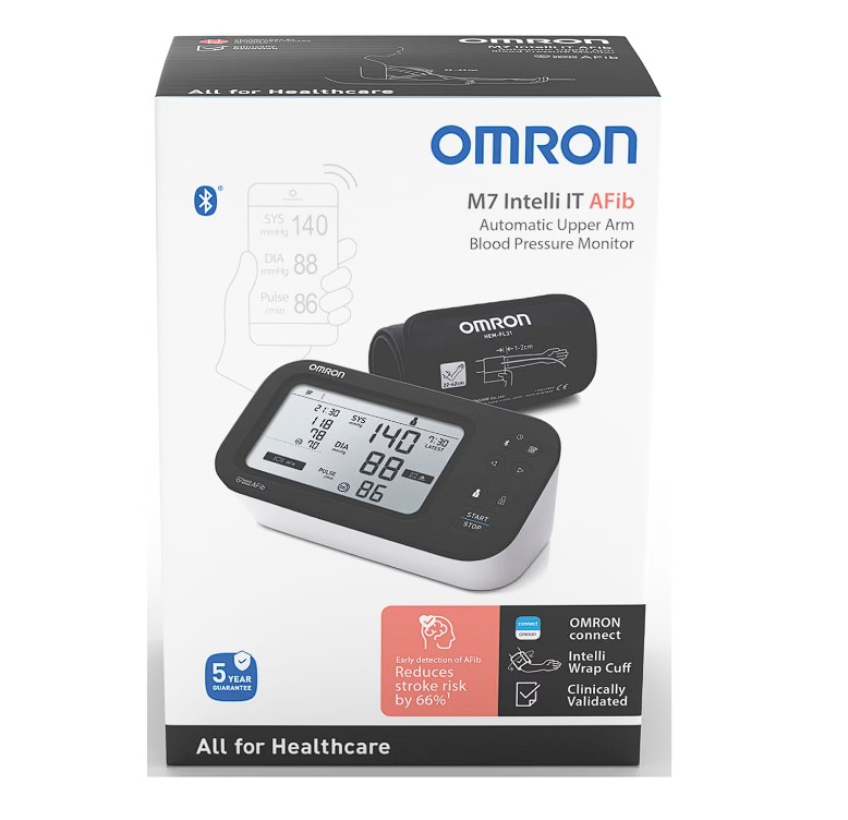 OMRON M7 Intelli IT - cu functie AFIB este un tensiometru compact, complet automat, pentru brat, care functioneaza pe principiul oscilometric. Aparatul masoara simplu si rapid tensiunea arteriala si pulsul. Pentru a asigura un nivel inalt de control si confort la umflarea mansonului, fara a fi necesare prestabilirea presiunii sau repetarea operatiunii de umflare, acest aparat utilizeaza tehnologia avansata IntelliSense.