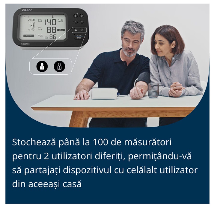 - Memorie pentru 2 utilizatori - inregistreaza ultimele 100 valori tensionale impreuna cu data si ora, pentru fiecare utilizator