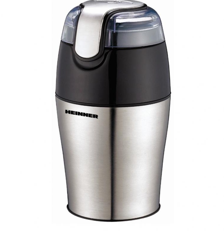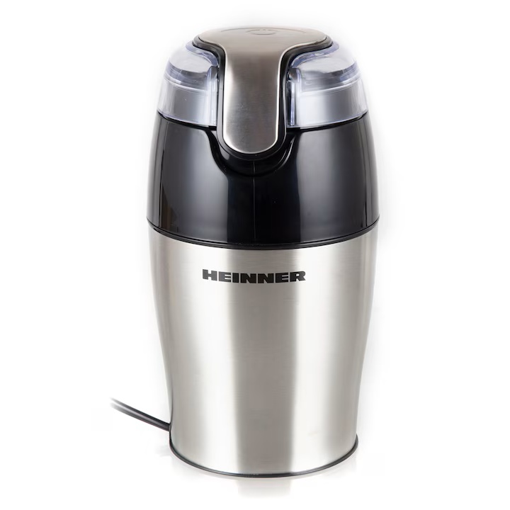 Rasnita electrica Heinner HCG-150SS, capacitate: 50g, putere: 150W, carcasa din inox, lama din inox, operare prin apasarea capacului, inox.