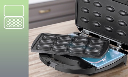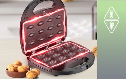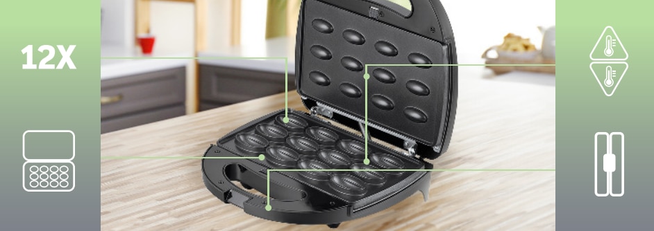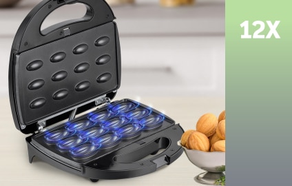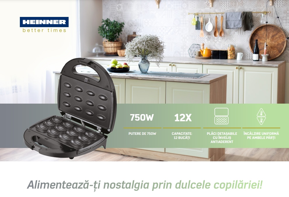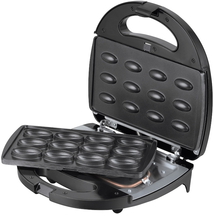 RESIGILAT - Aparat de facut nuci Heinner Dessert Supreme HNM-750BKS, 750W, capacitate 12 bucati, placi detasabile cu învelis neaderent, indicator luminos, manere termoizolate, Negru