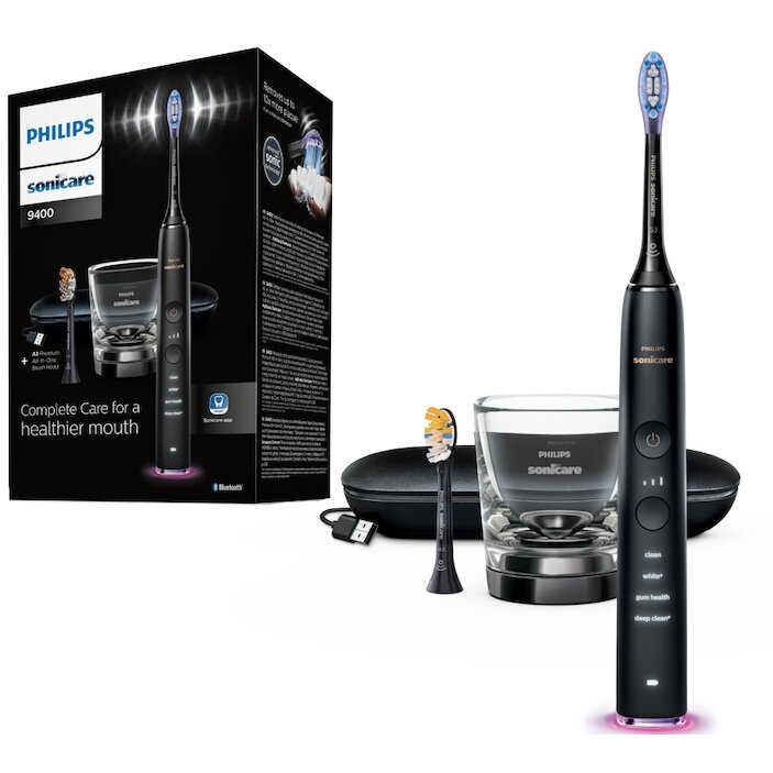 RESIGILAT Periuta de dinti electrica Philips Sonicare DiamondClean 9000 HX9917/89, 62000 miscari/minut, 4 moduri de curatare, 3 nivele intensitate, functia BrushSync, 2 baze de incarcare, 2 capete de periere, aplicatie Sonicare, Negru