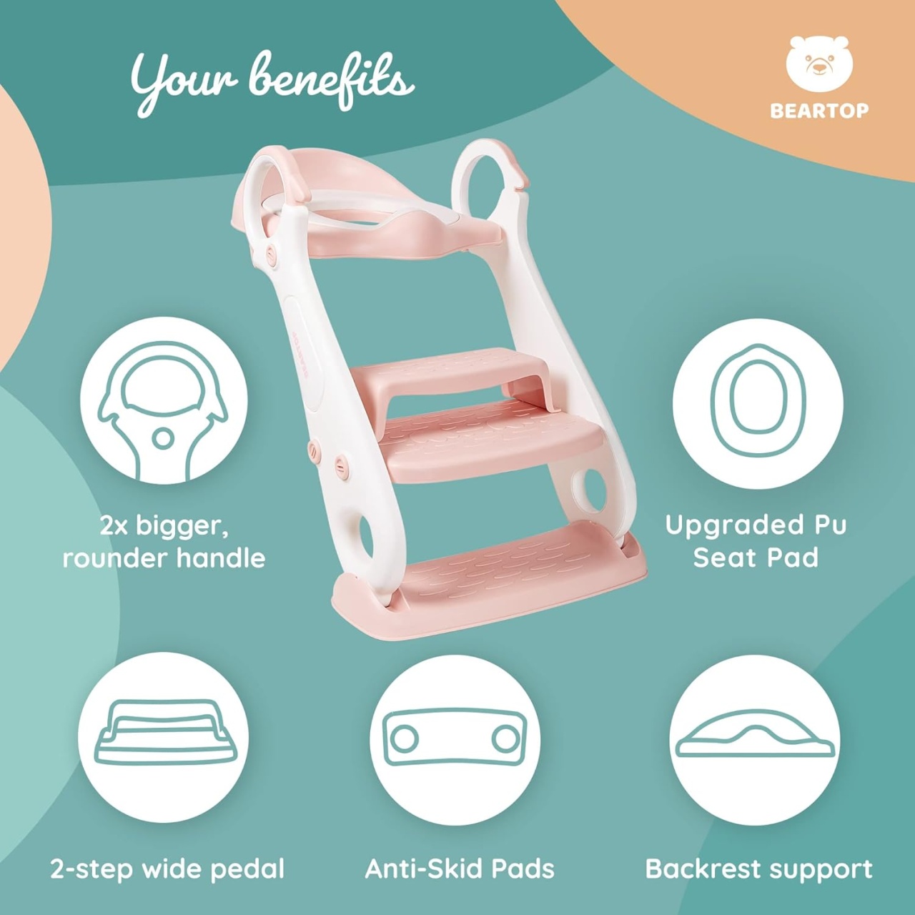 Scaunul pentru toaletă Beartop este ideal pentru a ajuta copilul tău să își dezvolte independența, în timp ce îi oferă un loc sigur și confortabil pentru utilizarea toaletei.