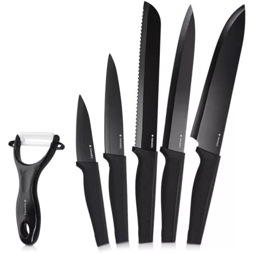 Set 5 cutite de bucatarie, din otel inoxidabil, 1 cutit de curatat din ceramica, Navaris, negru, Resigilat, Grad A