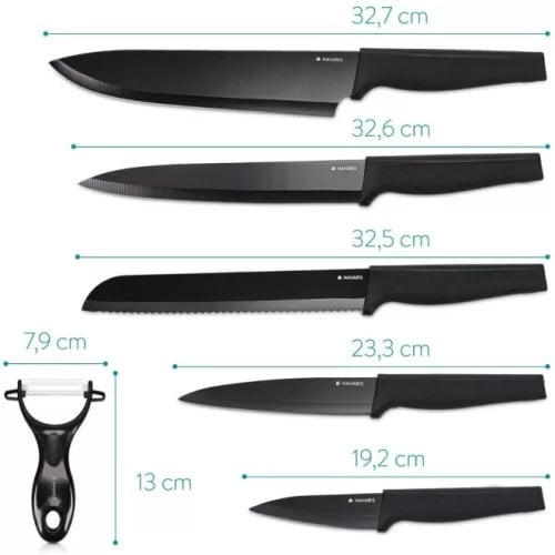 Cu cuțite mici și mari de diferite lungimi (3 x 20,3 cm, 1 x 12,7 cm, 1 x 8,9 cm), sunt potrivite pentru tăierea cărnii, legumelor, pâinii sau prăjiturilor sau ca cuțit de fructe, cuțit de pește și cuțit de curățare.