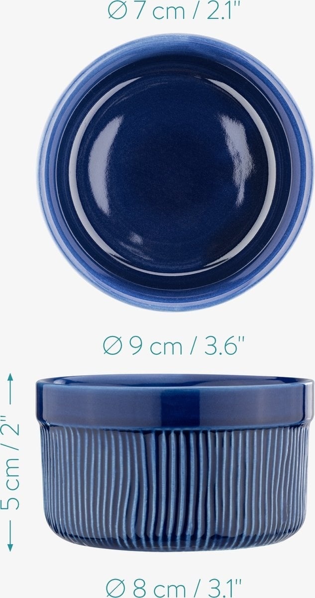 - DETALII: Obțineți un set de 6 vase de sufleu albastru care pot rezista la temperaturi de până la 220 ºC. Vasele de cuptor sunt realizate din ceramică robustă. Ø sus, 9 cm; Ø interior 7 cm; Ø jos 8 cm. Ramekins au o înălțime de 5 cm.