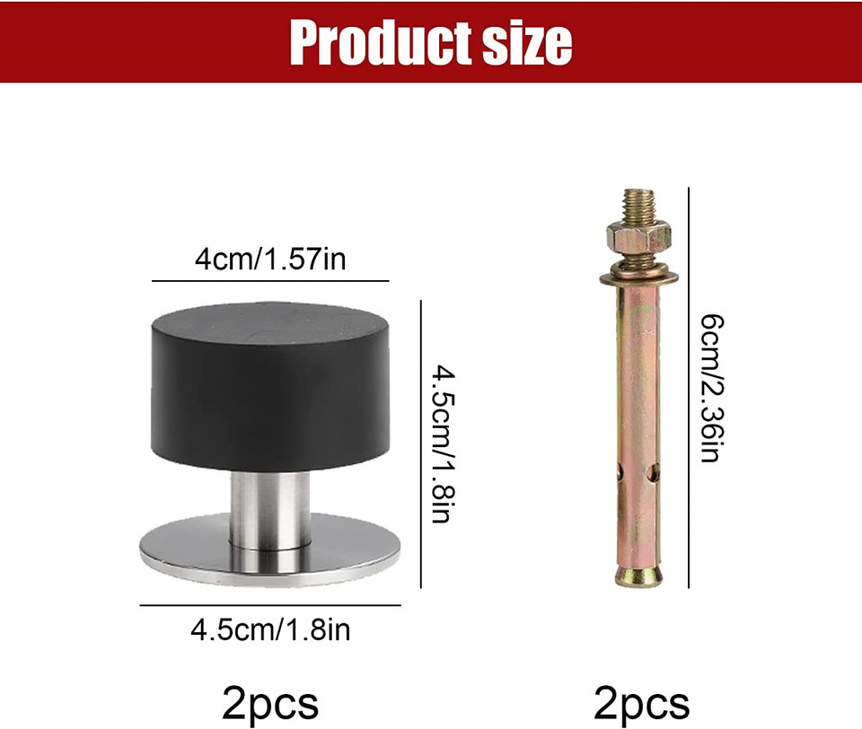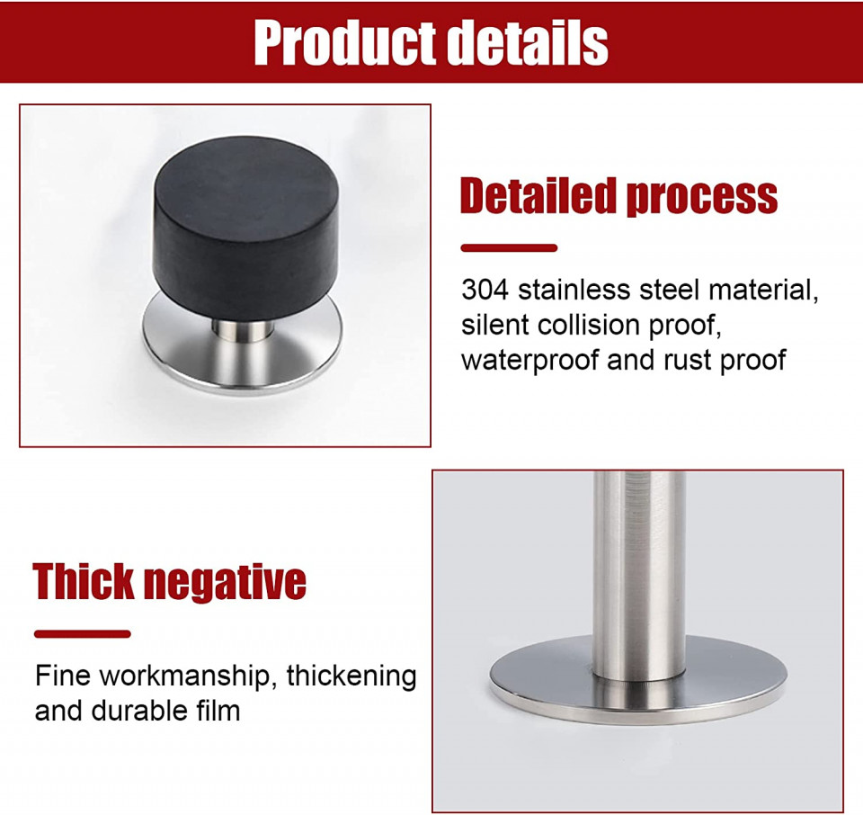 Dopul ușii este fabricat din oțel inoxidabil durabil, cu rezistență puternică la coroziune și oxidare, iar dopul durabil anti-rugină este fabricat din cauciuc durabil, cu un efect frumos de amortizare; cu acest dop de ușă puteți preveni în mod eficient deteriorarea ușilor, pereților sau mobilierului. Se potrivește în orice casă, oriunde. Designul modern unic și simplu, montarea pe perete și montarea pe podea, potrivite pentru orice scenă, pot fi instalate pe podea, ușă, perete.