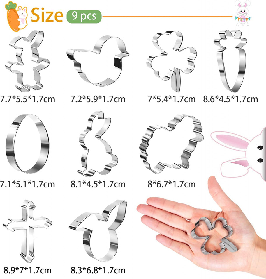 Cea mai bună combinație pentru Paște: acest set ingenios de tăietor de prăjituri de Paște conține pui, iepuri, morcovi, fluturi, tăietori de prăjituri cu ouă, forme pline de viață de animale și plante oferă copilului o surpriză neobișnuită și va adăuga mai multă distracție Paștelui.