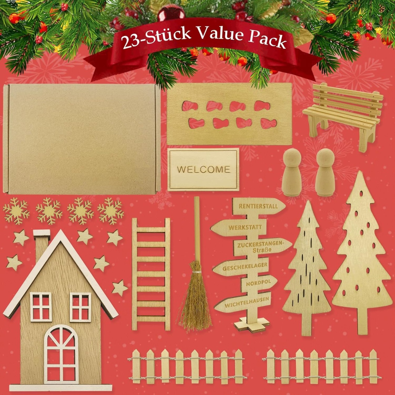 Set de mini-decoratiuni pentru Craciun Heimcore, lemn, natur, 25 piese