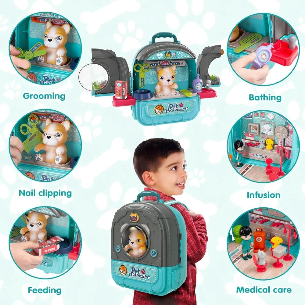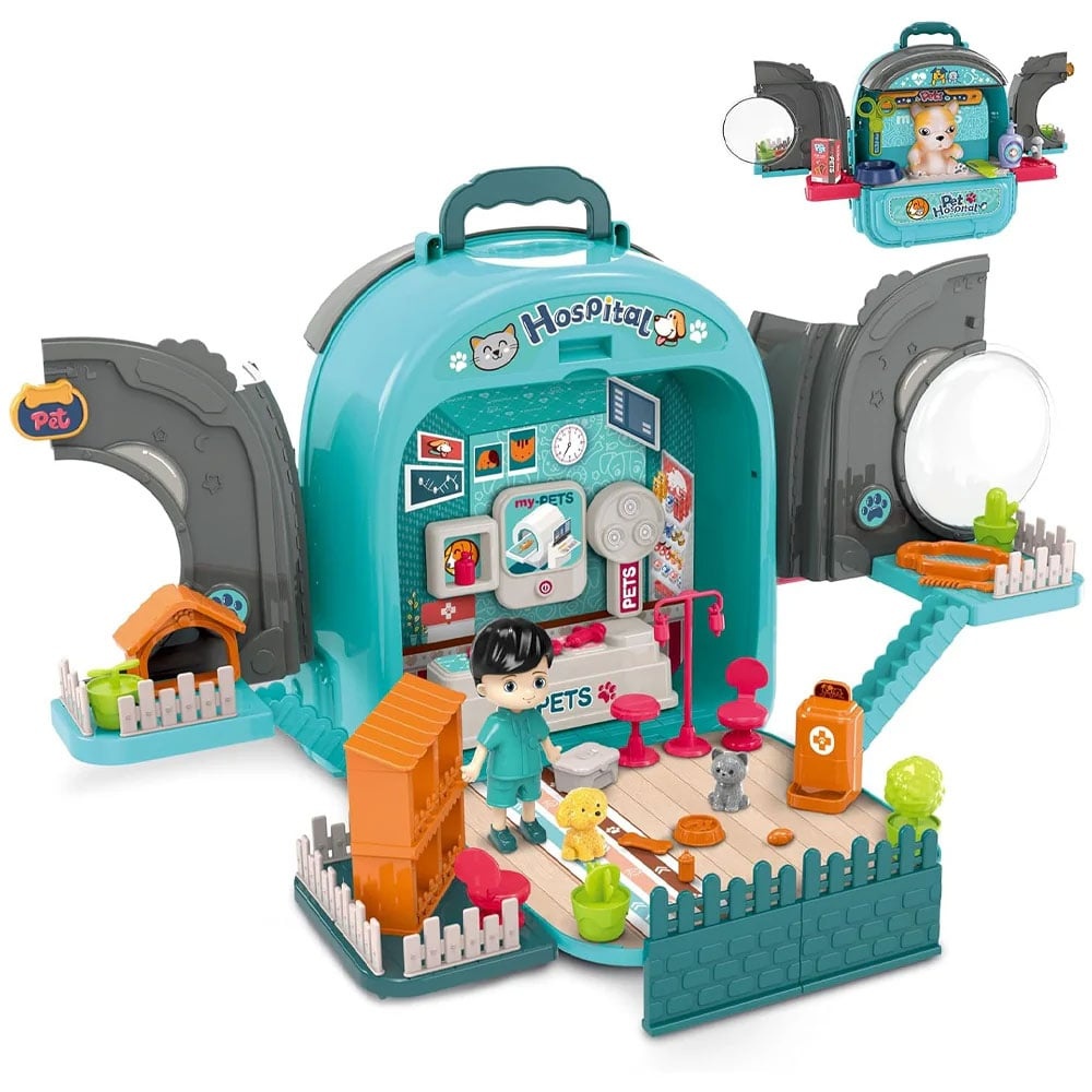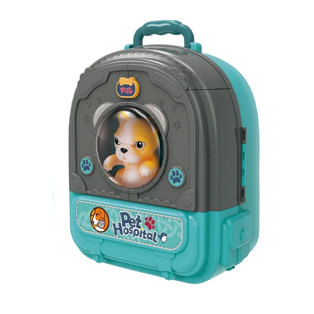 Set ghiozdan jucarie 3 in 1 Rovo 998-1, Spital Catel, Veterinar, Accesorii incluse