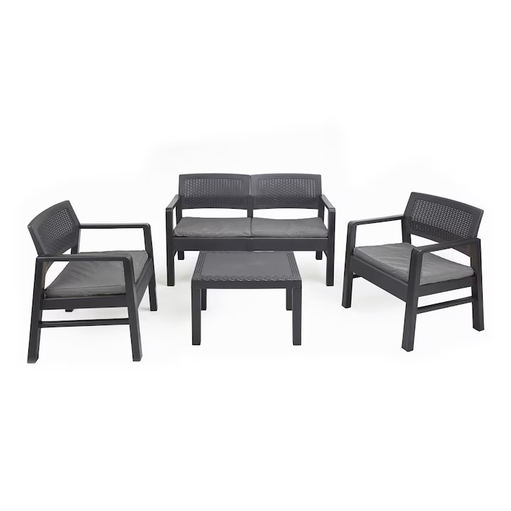 Acest set de mobilier este solutia ideala. Durabil, usor de intretinut si estetic placut, iti ofera tot ce ai nevoie pentru a crea un colt de relaxare perfect.