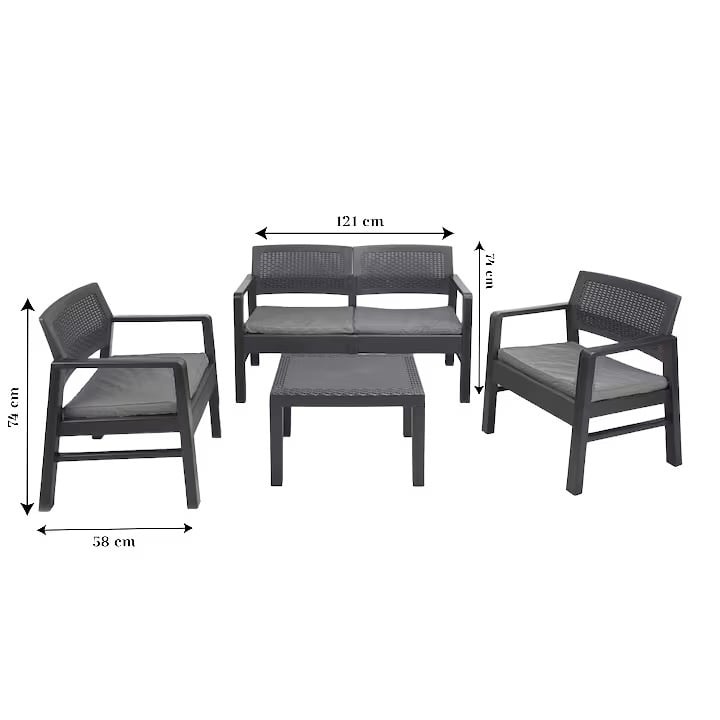 Set gradina/terasa, Progarden, KILIMANJARO, 4 piese, polipropilena, antracit, canapea 2 locuri 121x58x74 cm, 2 scaune 63x58x74 cm, masa 59x46x40 cm, perne incluse, Resigilat, Grad A