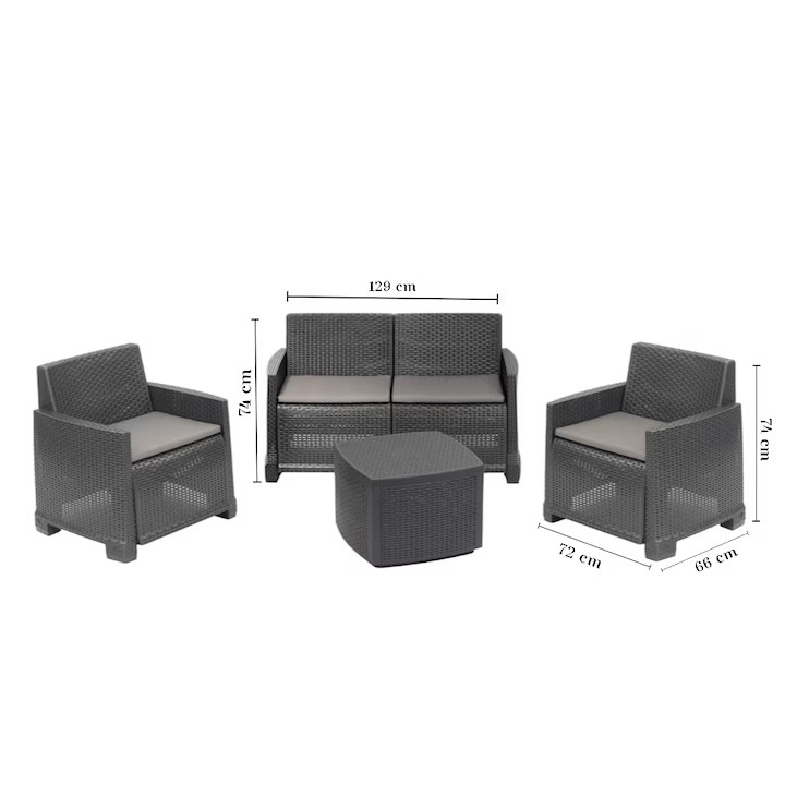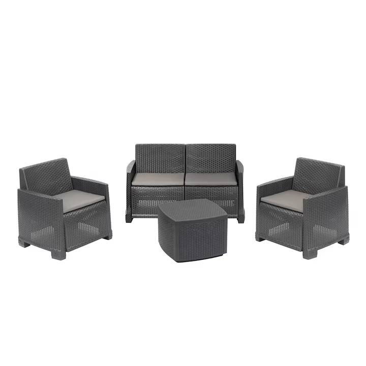 Set mobilier gradina/terasa, Progarden, COMO, 4 piese, polipropilena, antracit, canapea 2 locuri 129x66x74 cm, 2 scaune 72x66x74 cm, masa 53x53x40 cm, cu perne incluse, Resigilat, Grad A