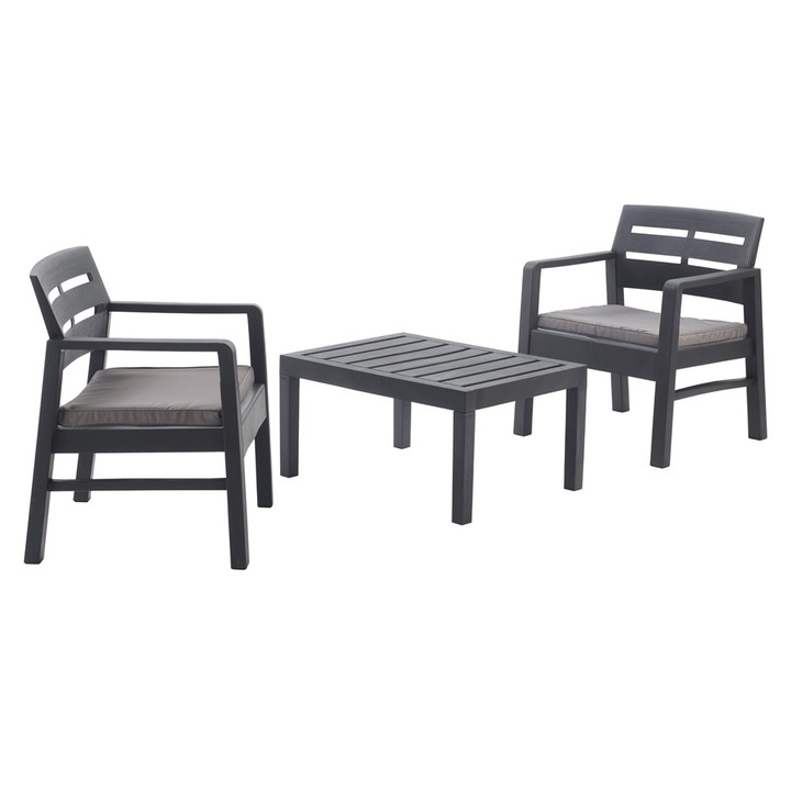 Set mobilier terasa/gradina, Progarden, LOMBOK, 3 piese, polipropilena, antracit, 2 scaune 63x58x74 cm, masa 74x55x38 cm, cu perne incluse, Resigilat, Grad A