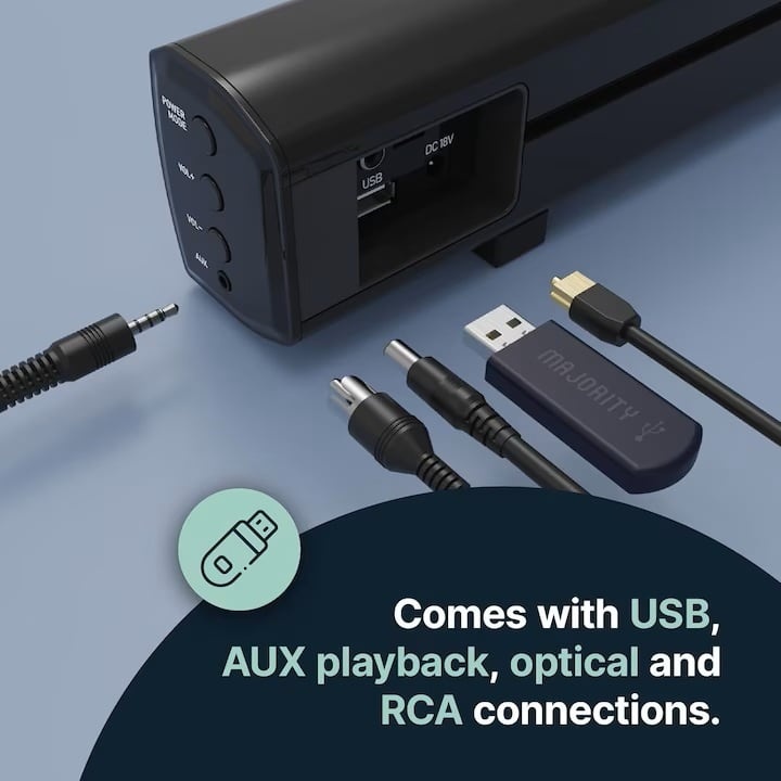 - PLEIN DE CARACTERISTICI: bara noastra de sunet MAJORITY a fost proiectata pentru usurinta de utilizare - pur si simplu conectati-l si jucati folosind o gama larga de conexiuni. Conectati-va la televizor la viteza fulgerului folosind intrarea optica, ascultati listele de redare direct de pe telefon prin tehnologia Bluetooth, conectati playerul MP3 la intrarea AUX sau pur si simplu conectati dispozitivul USB direct la Bowfell.