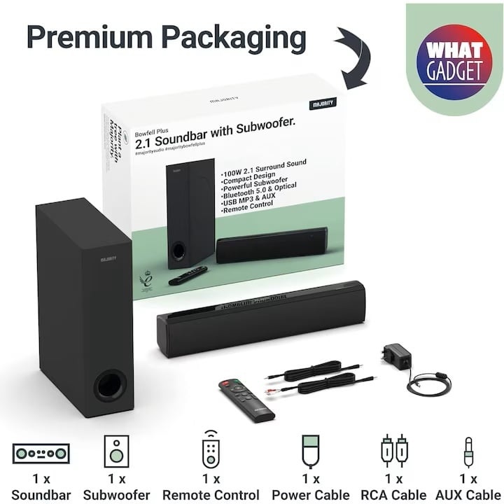 - CALITATE A SUNETULUI CRYSTAL CLEAR: Bara de sunet Bowfell este proiectata chiar aici, in Marea Britanie, de catre grupul nostru de experti audio. MAJORITY Bowfell este o bara de sunet TV puternica, dotata cu tehnologie audio si compatibila cu o gama larga de articole de uz casnic, cum ar fi telefonul, televizorul, computerul, laptopul, proiectorul, monitorul, Blu-Ray sau DVD playerul. Calitatea noastra digitala imbunatatita a sunetului este proiectata si perfectionata in Cambridge Marea Britanie.