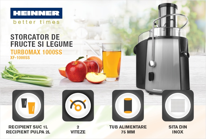 Storcator de fructe si legume Heinner XF-1000RD, 1000 W, recipient suc 1 l, recipient pulpa 2 l, 2 viteze, tub de alimentare 75 mm, inox