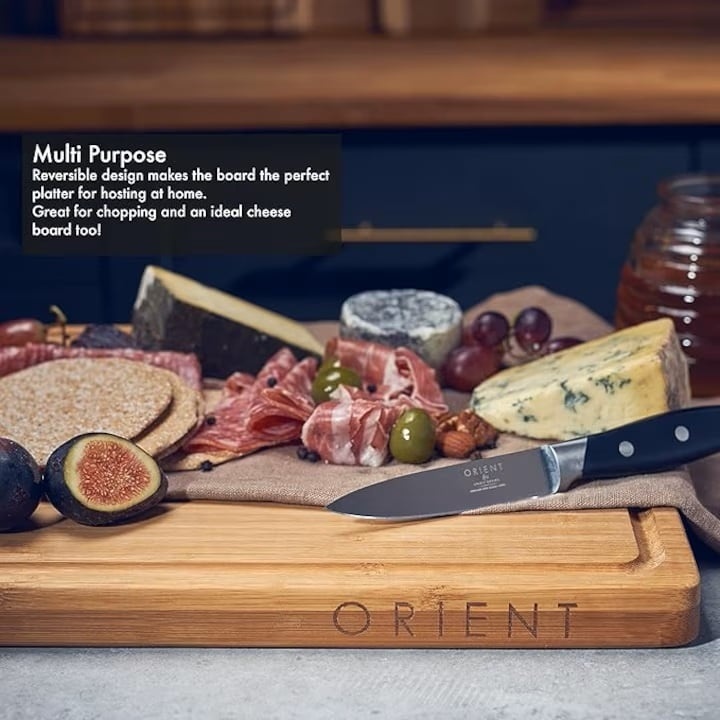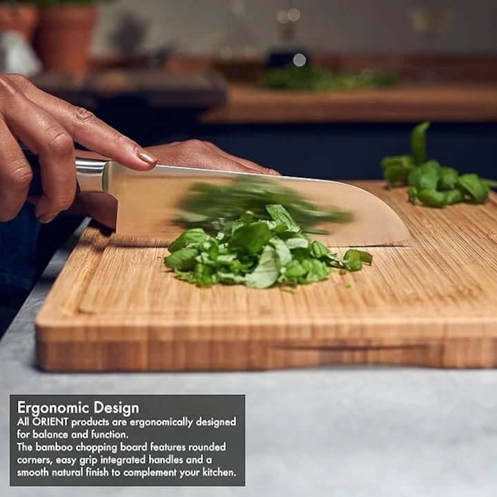 La ORIENT producem unelte si accesorii de calitate profesionala pentru bucataria dumneavoastra. Suntem constienti de importanta designului de inalta calitate si, prin urmare, fabricam fiecare produs cu caracteristici ergonomice si componente inteligente.Cu experienta noastra in fabricarea de cutite si excelenta in productie, am dezvoltat o gama de placi de taiat care sa se potriveasca tuturor bucatariilor.La ce te poti astepta- Fabricat manual din boabe durabile de bambus- Design ergonomic, manere integrate discret pentru utilizare pe ambele parti- Canal de suc integrat pentru a va proteja blatul de lucru- Spatele neted serveste ca masa de servire sau farfurie cu branza- Finisaj cu ceara de albine de calitate alimentara